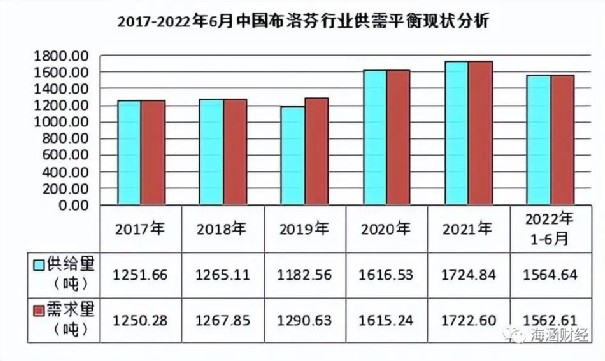 2021年,中国布洛芬,需求量为1722.60吨,产能1.4万吨。大约占全球产能1/3。