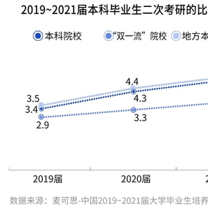 激烈的竞争已使得应届本科毕业生首次考研失利的情况增加,二次考研群体不断扩大。2021届本科毕业生中,准备考研(不就业,脱产备考)的比例为6.1%;其中,二次考研的比例达到4.9%,较前两届同期(2019届3.4%,2020届4.3%)有所上升。