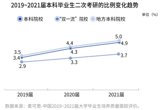 不只是二次考研群体不断扩大。根据近五年发布的《中国本科生就业报告》(就业蓝皮书)数据,应届本科毕业生国内读研比例从2017届的14.1%逐年增至2021届的17.2%,上升了3.1个百分点。其中,“双一流”院校国内读研比例增幅更为明显,从2017届的28.5%增至2021届的35.4%,上升了6.9个百分点。