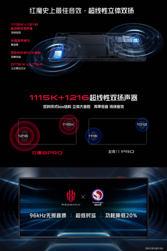 另外,红魔8 Pro系列还支持1115K+1216超线性立体双扬,双封闭式BOX结构大音腔,更浑厚;96kHz无损音质,无论用户外放和无线都能给你带来声临其境的视听盛宴,号称红魔史上最 佳音效!