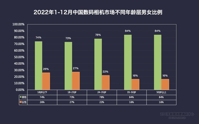 2022年1-12月中国数码相机市场不同年龄层男女比例(数据来源:ZDC)