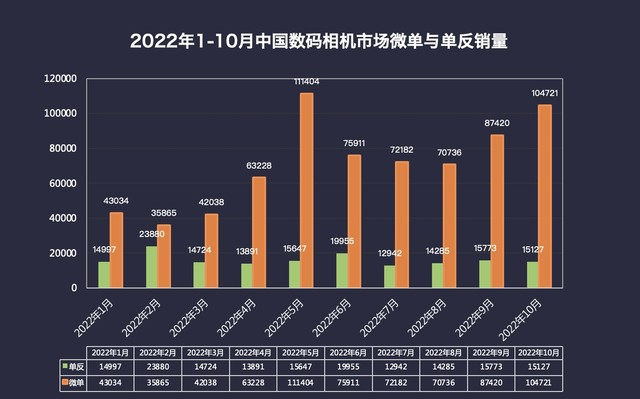 而在中国数码相机市场,微单一家独大的情况则更加明显。2022年1-10月份,国内微单相机销量为706539台,远超单反相机161221台和固定镜头相机177868台的销量。在月销量统计数据上可以看到,今年5月份微单相机和单反相机的销量差距最为明显,微单相机的销售数据高达111404台,而单反相机的销量仅为15647台,微单是单反销量的7倍多。
