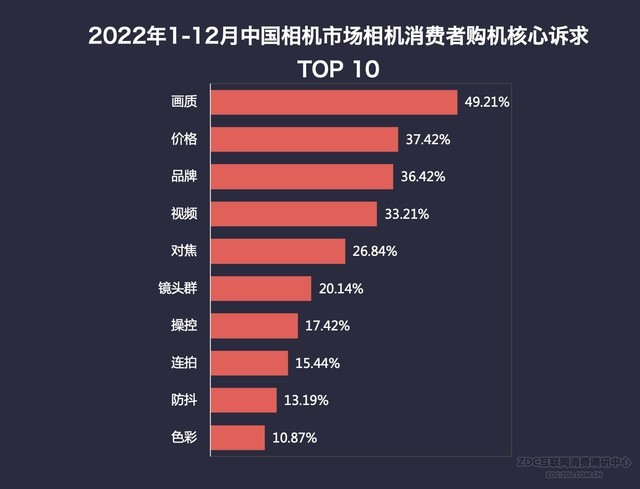 2022年1-12月中国数码相机市场消费者核心购机诉求TOP10(数据来源:ZDC)