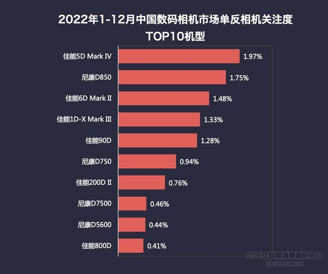 2022年1-12月中国相机市场单反相机关注度TOP10(数据来源:ZDC)