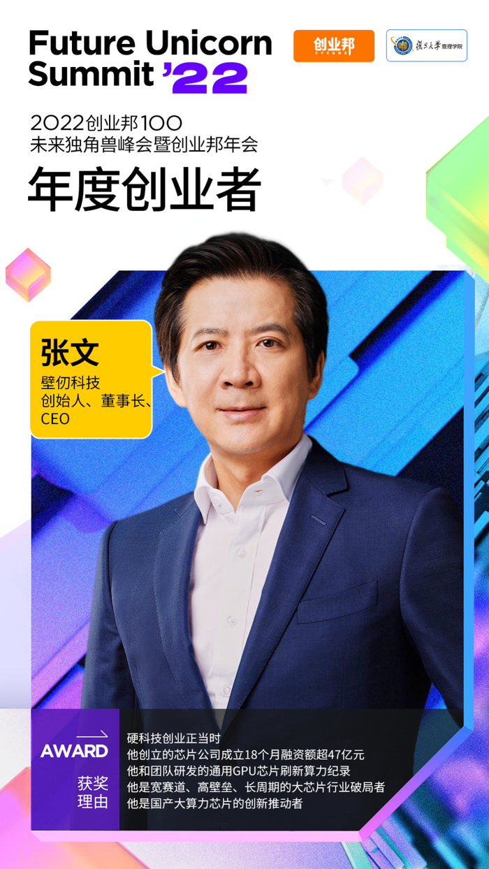 大家好,我是壁仞科技创始人张文,很荣幸能获得创业邦2022 “年度创业者”大奖,感谢大家对我和壁仞科技的支持和肯定。2022年对我们来说是重要的、里程碑式的一年,遇到了很多挑战,也取得了一些关键性的成果,这里我也想分享一些感悟,与大家共勉。