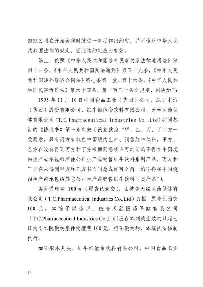 12月29日晚间,华彬集团于公众号发布《中国红牛关于50年《协议书》法院判决有效的声明》,称收到广东省深圳前海合作区人民法院民事判决书((2019)粤 0391 民初725 号,下称“判决书”),并表示上述判决不仅认定了华彬集团自1995年始享有在中国境内独家经营红牛饮料50年的合法性,而且也确认了泰国天丝及任何第三方在中国生产销售红牛饮料行为的非法性。