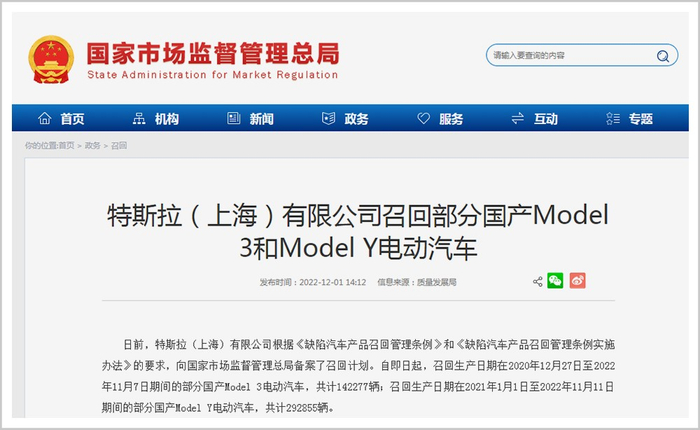 2022年12月1日,国家市场监督管理总局发布最新消息:特斯拉实施年内最大规模召回,涉及43.5万辆的Model 3、Model Y。