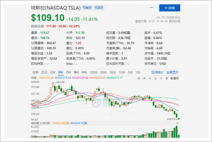 美东时间12月27日,特斯拉股价大跌11.41%,收盘报109.1美元,创两年来新低。