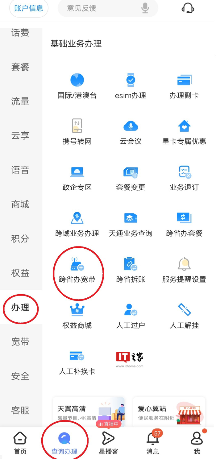 根据IT之家小伙伴的发现,中国电信在其 App 中推出了“跨省办宽带”业务,用户需在中国电信 App - 查询办理 - 办理 - 跨省办宽带中办理。