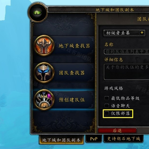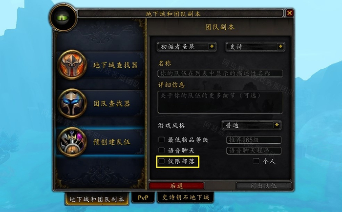 3. 在队伍查找器-预创建队列中,选择队列创建队伍,若不勾选仅限部落 / 联盟,则默认是跨阵营。