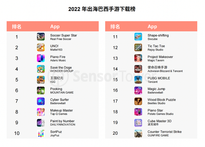 以巴西出海手游市场为例,巴西市场作为近年来热度逐渐攀升的游戏出海市场,目前与全球重点市场之间差异,正在急剧缩减。具体而言,一方面休闲类游戏在巴西出海市场的下载量急剧攀升;另一方面,恰逢“世界杯年”, 足球游戏在巴西受众广泛,加之世界杯的热度,使得出海手游《Soccer Super Star》成功拿下 2022 年下载榜首位。