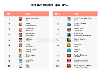 具体而言,以美国市场为例,该国的休闲类手游买量地位仍然牢固排名首位,且在单品的下载量以及收入的表现上依旧突出。 收入层面,经典三消手游《Candy Crush Saga》依靠频繁的关卡更新维持着稳定的用户活跃与营收,并在 2022 年超过《Roblox》重登美国畅销榜榜首。而在 2022 年美国手游下载榜 Top 20 中,共 7 款为超休闲品类,可见该品类巨大的市场潜力。