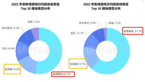 《青青草原》拔得2022新增游戏日均投放创意组头筹,而旧游的日均投放榜一为《捕鱼大咖》。网赚类游戏在两个榜单中,分别上榜的数量最多。从新\旧投放Top 30 的手游类型分布对比上看,旧游中角色扮演游戏上榜数量相对较多,而新游中则更“轻度化”,休闲益智类游戏相对占优优势。新旧榜单的投放媒体类型对比层面,联盟媒体(如穿山甲、优量汇等)投放热度最高,投放占比均过半,其次为短视频媒体平台。