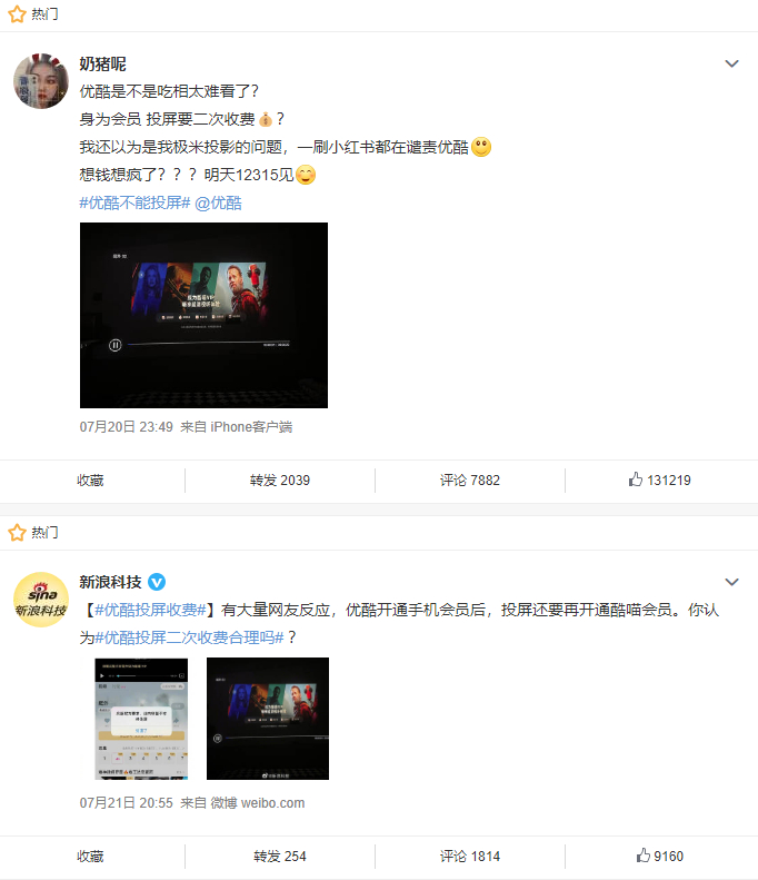IT之家了解到,这不是优酷第一次因为会员问题引发争议,2022年7月,有大量网友反映就算是开通优酷VIP会员权益后也已经无法再用投屏的方式免费“蹭”大屏,只能根据提示升级为视频平台的大屏会员(酷喵会员)。该话题一度登上热搜。