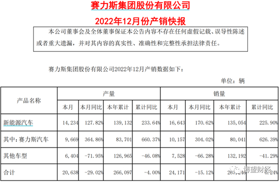 刚刚步入2023年,塞力斯便“火急火燎”的发布了去年12月份产销快报,全年新能源汽车产销量分别为13.91万辆、13.51万辆,同比分别增长233.64%、225.90%,其中12月单月产销量分别为1.42万辆、1.66万辆,同比分别增长127.82%、170.62%,仅AITO问界销量便达到10143辆,位居造车新势力前列。