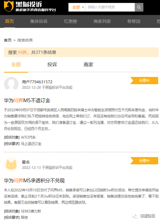 打开黑猫投诉平台,通过检索“问界”关键词,可以找到上百条投诉信息。