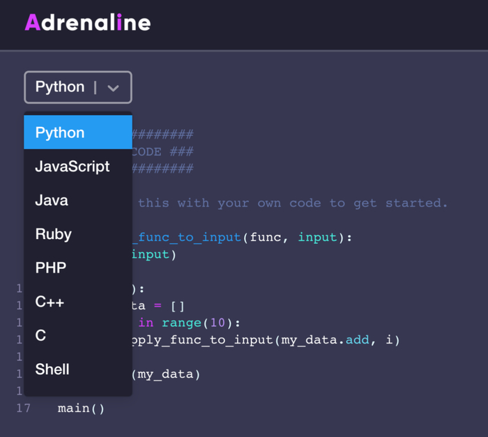 目前,Adrenaline 支持 Python、JavaScript、Java、Ruby、PHP、C++、C、Shell 多种编程语言。