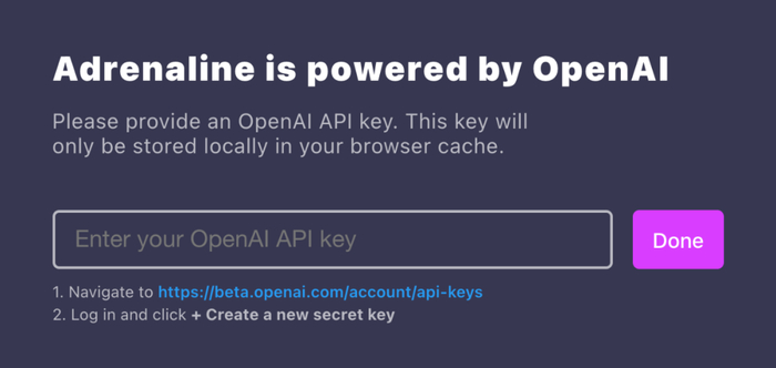 请注意,使用 Adrenaline 的前提是,用户必须从 OpenAI 控制台提供自己的 OpenAI API 密钥。这是为了防止 API 滥用。