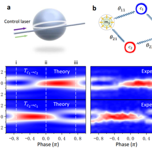 图注:a-b.光力微腔中四模式耦合;c.相位控制的非互易频率转换的理论和实验结果。