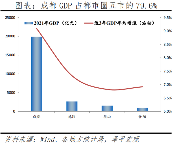 成都尚处于做大做强吸聚周边资源阶段,人口经济集聚度高。成都都市圈以素有“天府之国”称号的成都平原为主体,与联系紧密的德阳市、眉山市、资阳市共同组成,包括成都市,德阳市旌阳区、什邡市、广汉市、中江县,眉山市东坡区等,面积2.64万平方公里,2021年末常住人口约2761万人,GDP为2.5万亿元。2021年11月,四川省政府正式印发《成都都市圈发展规划》,规划都市圈范围拓展到成都、德阳、眉山、资阳全域,总面积3.31万平方公里。成都都市圈是继南京、福州都市圈以后,国家层面批复的第三个都市圈规划,也是中西部唯一一个。成都吸聚周边人口显著,2018年常住人口达2119万人,占都市圈五市总人口的76%;2015-2021年成都市常住人口年均增长76万人,与同期整个都市圈人口增量几乎相等。成都2021年GDP达1.99万亿元,在二线城市中仅次于重庆、苏州,占成都都市圈GDP的79.6%;中心城市产业集聚度远大于长三角、珠三角发达都市圈。