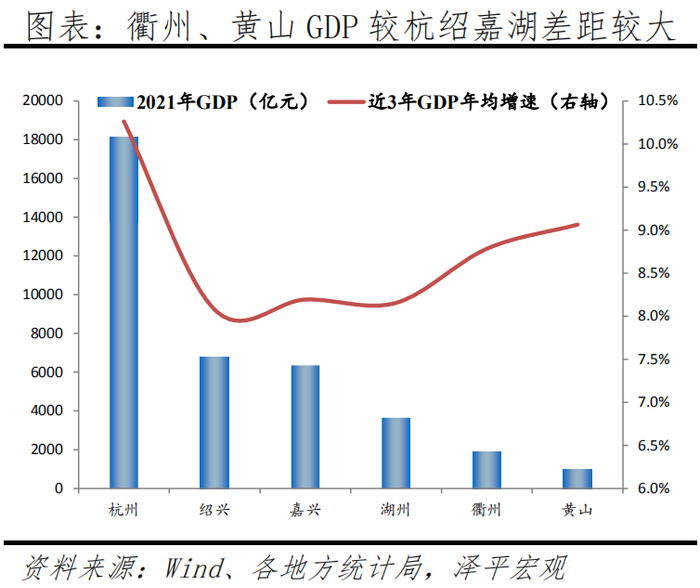 杭嘉湖绍四市产业协同程度高,嘉兴的海宁、桐乡,绍兴的柯桥、诸暨等县市均与杭州产业密切融合。毗邻杭州下沙经开区的海宁高新区有70%的企业是由杭州迁入,包括娃哈哈、西子重工等杭企;德清有约四分之一的高新技术企业、30%以上的高端人才、60%以上的科技成果转化中心来自杭州。受益于杭州电子商务中心地位及2015年杭州跨境电子商务综合试验区获批,湖州、嘉兴、绍兴等地传统外贸产业利用“互联网+”拓展新空间,电子信息产业发展均居浙江前列。都市圈新成员衢州、黄山2021年GDP分别仅为1875、957亿元,比杭嘉湖绍四市中最小的湖州也相去甚远。衢州、黄山融入都市圈后产业转移承接和项目对接正在大大加强。黄山将立足长三角生态屏障、徽文化等优势实施文旅一体化战略,开展大数据资源富矿区建设;衢州则立足“四省通衢”区位及国家公园试点,培育新能源、新材料、高端设备等产业,打造钱塘江源头大花园、智慧产业新高地。