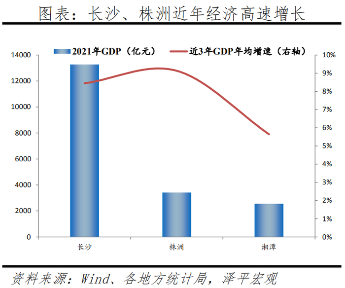 长株潭三市产业互补性强,产业协同势头良好,是中部崛起重要战略支点之一。湖南作为东部沿海地区和中西部地区过渡带、长江开放经济带和沿海开放经济带结合部,有着得天独厚的区位优势。长株潭都市圈(与以长株潭三市为核心的“3+5”环长株潭城市群范围不同)包括长沙市全域、株洲市中心城区及醴陵市、湘潭市中心城区及韶山市和湘潭县,面积1.89万平方公里,2021年常住人口1484万,经济总量1.79万亿元。2007年长株潭获批全国“两型”社会建设综合配套改革试验区以来,长株潭都市圈同城化建设加快推进,都市圈竞争力、经济实力显著增强。近年省会城市长沙经济持续高速增长,2021年GDP达1.3万亿元,为全国24个万亿俱乐部城市之一,对周边城市经济带动作用日益增强。2015-2021年,长沙常住人口年均增长高达32.7万人,人口吸聚能力强劲。从1984年正式提出建设长株潭经济区方案至今,长株潭一体化发展经历几十年有效探索,已成为湖南全省现代化建设和全方位开放的战略支撑。