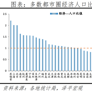 中国人口和产业持续向大都市圈集聚,未来大都市圈人口占比仍将继续提升。中国34个1000万人以上大都市圈人口总体持续流入,2021年常住人口合计占比62.8%,经济总量占比77.6%,经济-人口比值为1.24,人口仍有流入倾向。在34个千万级大都市圈中,苏锡常、上海、北京等3个都市圈经济-人口比值大于2;南京、杭州、厦漳泉、宁波、深圳等5个都市圈介于1.5-2.0之间;长株潭、广州、福州、青岛等14个都市圈介于1-1.5之间;昆明、长吉、南昌等12个都市圈经济-人口比值小于1,且部分都市圈经济-人口比值较低与划分范围过大有关。