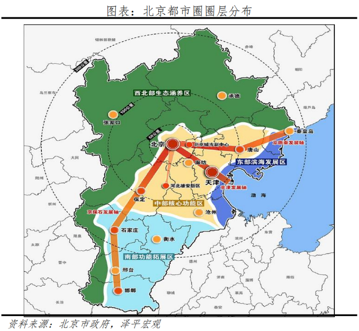 疏解北京非首都功能,从摊大饼式单中心辐射向紧密集约型多组团格局转变。北京都市圈尚无明确的文件和规划。若以1小时通勤圈为标准,北京都市圈包含北京市大部分区域以及北京以东、以南方向的廊坊北三县、固安、廊坊市区、涿州、武清等地。距离北京中心城区更远的天津、唐山、保定、雄安新区等则属于京津冀城市群范畴。北三县划归北京的传言自20世纪六七十年代起便一直存在,但多次被证伪,未来跨区协调发展将成为代替行政区划调整的主要手段。2020年3月,国家发改委正式发布北三县与通州区“四统一”的规划,区域一体化发展向前迈进一步。北京都市圈面积约2.2万平方公里,2021年常住人口在2700万以上,GDP约4万亿,其中北京GDP突破4万亿元,仅低于上海;而环京地区仅为北京的零头,2021年廊坊市GDP为3553亿元。近年由于北京严控人口、疏解产业,周边区域承接一部分人口转移,近五年北京常住人口几乎0增长,廊坊近五年常住人口年均增量约18万人。根据《北京城市总体规划(2016-2035)》,北京市域范围内要形成“一核一主一副、两轴多点一区”的城市空间结构,着力改变单中心集聚的发展模式,疏解核心功能区和中心城区非首都功能,建设城市副中心以及顺义、大兴、亦庄、昌平、房山等多个重点疏解承接新城,构造城市西部、北部的生态涵养区,探索出人口经济密集地区优化开发的新模式。参考这一规划,我们可以将北京都市圈大致划分为梯度辐射的三个圈层:一是中心城六区,疏解非首都功能;二是城市副中心及城市发展新区多个新城,坚持集约发展,承接中心城区适宜功能及新增首都功能,辐射带动北京周边地区协同发展;三是生态涵养区及北京以东、以南的环京地区。