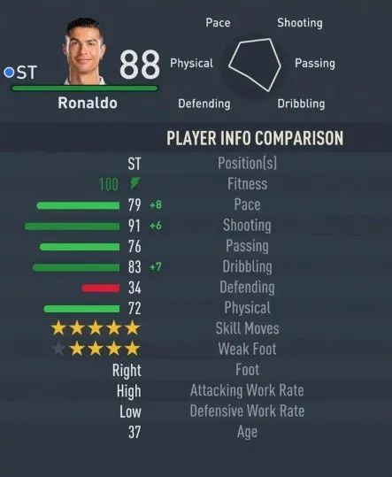 最近,官方在《FIFA23》里的开球模式(Kick-Off mode)和生涯模式中下调了C罗的能力值,球员的总体评分已经从原来的90下降到了88。