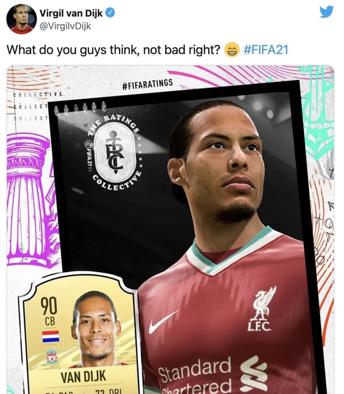 前面提到,FIFA中的90分是顶级球员的分隔线,在19-20赛季中帮助利物浦以99分的成绩提前7轮夺得英超冠军的范迪克,就在《FIFA21》中成功上涨到了90分。而他本人在知道这个消息后,也迅速发推特炫耀。