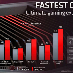 上述两款显卡在幻灯片中,是分别击杀RTX 4080和RTX 4070 Ti,而从之前的测试看,RX 7900 XT确实比4070 Ti更快,毕竟多了8GB显存和67%的内存总线,这不足为奇。