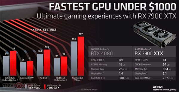 现在,AMD更新了幻灯片,按照官方的口吻,RX 7900XT为“900美元价位最快GPU”,RX 7900XTX之为“1000 美元价位最快GPU”。