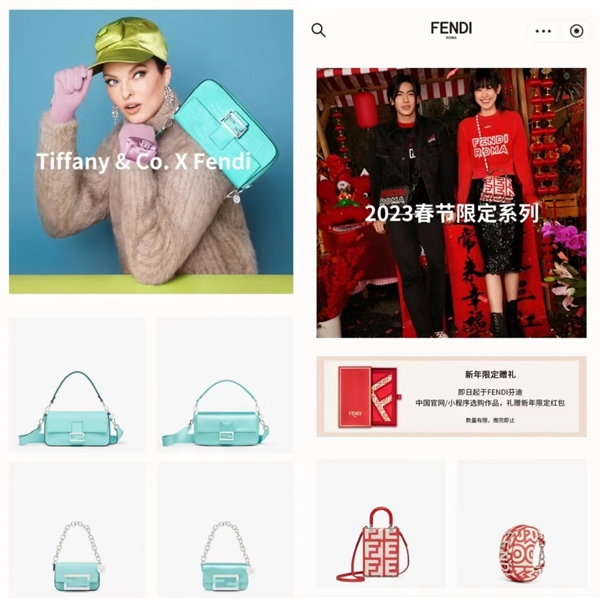 FENDI 携手京东在年货节期间重磅首发两大年度新品,包括第一次与Tiffany&Co 合作的Tiffany&Co. x Fendi 联名系列,以及品牌2023春节限定系列。其中, Tiffany&Co. x Fendi胶囊系列将标志性的蒂芙尼蓝,通过皮革、丝缎材质重塑Baguette手袋,并配以带有银色链锁的迷你吊饰;FENDI春节限定系列灵感来自 Marc Jacobs 为 Baguette 手袋25周年庆系列设计的 FENDI Roma logo,通过象征好运与喜庆的红白主色调营造出浓郁节日氛围。即日起消费者在FENDI京东官方旗舰店选购商品,还可获得新年限定赠礼红包。