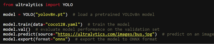 上面的代码表明,首先需要在 COCO128 数据集上训练 YOLOv8 Nano 模型,然后在验证集上对其进行评估,最后对样本图像进行预测。