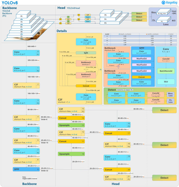 YOLOv8 还高效灵活地支持多种导出格式,并且可在 CPU 和 GPU 上运行该模型。YOLOv8 的整体架构如下图所示:
