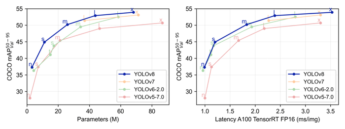 从下图我们可以看到,YOLOv8 在目标检测和实例分割任务上的性能很好: