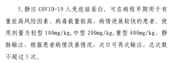 ↑方案在抗病毒治疗方面提到静注COVID-19人免疫球蛋白。