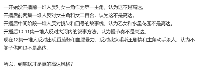 如果以系列以往作品的风格来看,本作确实“很不高达”。尽管什么是高达至今仍未有过定论,不过大家还是更想看到两大势力之间的冲突、新旧理念的碰撞、对宏大战争的思考等主题,而非市面上流行的校园题材。