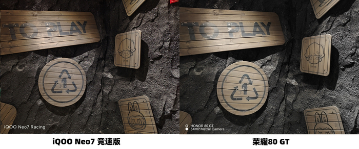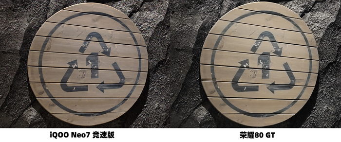 通过放大观察木板上的细节,iQOO Neo7 竞速版对于细节的记录相对详细,一些做旧的痕迹都能看到;反观荣耀80 GT,可能是算法对于木板做旧破损的部分有所优化,很多细节处都出现了涂抹的情况。