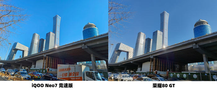 在这组白天自然光环境下的超广角样张中,两款产品的表现与主摄类似,iQOO Neo7 竞速版的画面色彩更加讨喜,荣耀80 GT更接近写实风格。在超广角畸变的问题上,二者旗鼓相当,都属于正常表现。除此之外在画面锐化程度上,iQOO Neo7 竞速版则是有些过锐;荣耀80 GT的锐化表现偏弱一些,建筑中心部分出现了一些涂抹的情况。
