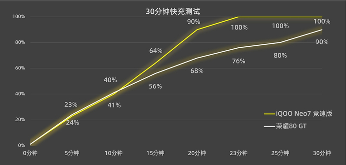 在30分钟的快充测试中,虽然荣耀80 GT仅仅搭载了66W超级快充,但在前10分钟的快速回血能力上并不逊色于搭载了双电芯120W超快闪充的iQOO Neo7 竞速版。不过10分钟后,荣耀80 GT的充电速度开始放缓。最终iQOO Neo7 竞速版充满耗时23分钟,荣耀80 GT充满耗时41分钟。
