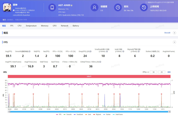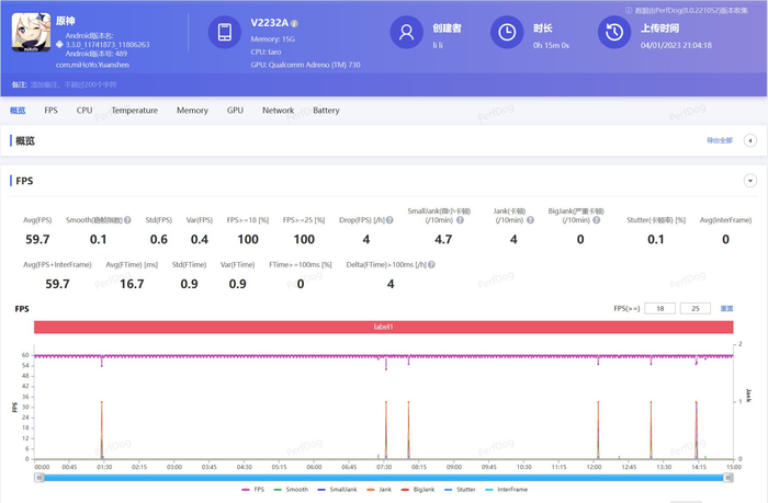 除了跑分以外,游戏实测也是性能评测的重头戏。由于iQOO Neo7 竞速版搭载了满血版第一代骁龙8+,因此我们直接跳过了压力相对较低的《王者荣耀》和《和平精英》的测试,直接来到最高画质的《原神》进行15分钟跑图测试: