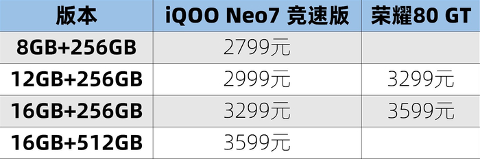这里我们还是直接列个表格,iQOO Neo7 竞速版提供了4个内存版本,起售版本为8GB+256GB,价格为2799元;荣耀80 GT则是提供了两个比较实用的大内存版本,起售版本为12GB+256GB,价格为3299元。