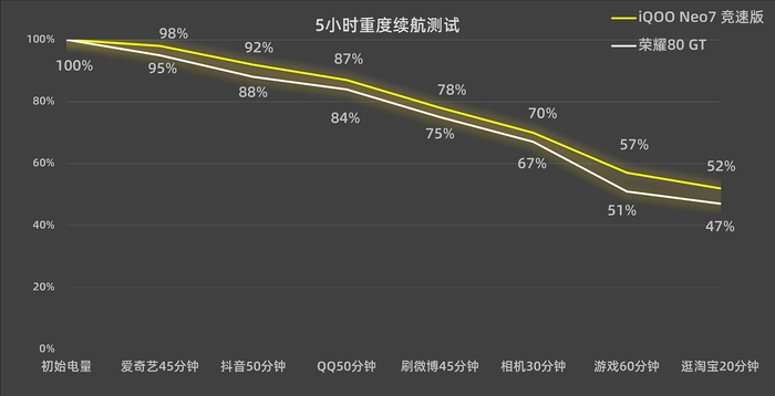 iQOO Neo7 竞速版搭载了双电芯120W超快闪充和等效5000mAh电池的续航配置;荣耀80 GT则是搭载了66W超级快充和等效4800mAh电池配置。当然,硬件配置可能并不能和实际体验画等号,这里我们还是通过实测来看看两款产品的续航性能表现。