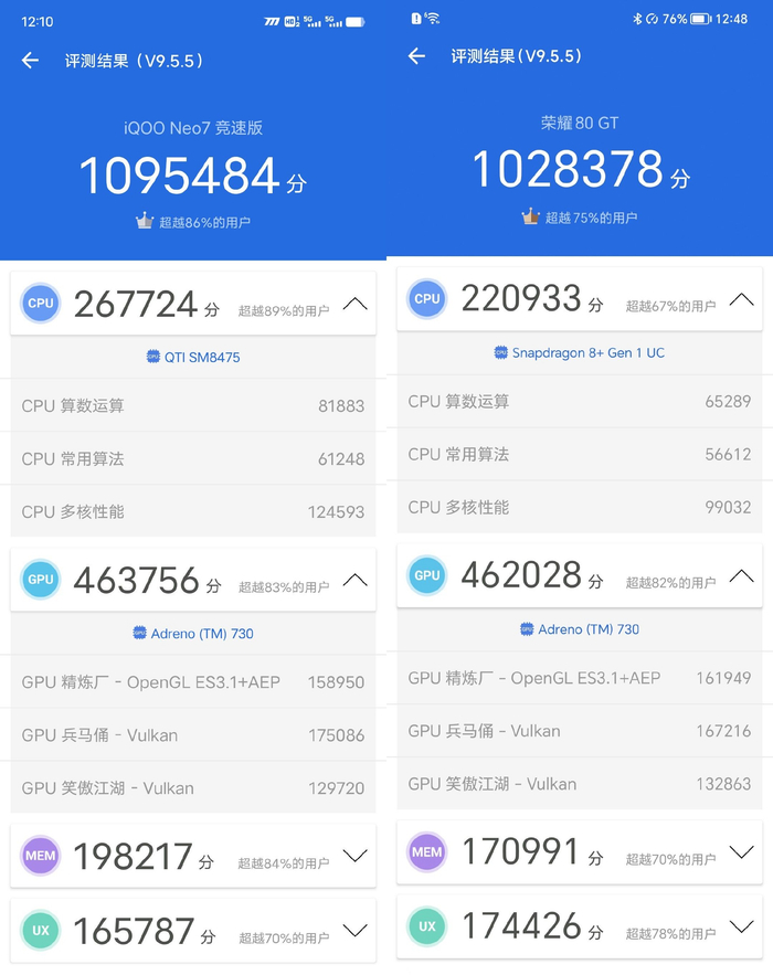 通过跑分来看,iQOO Neo7 竞速版相较于荣耀80 GT主要优势集中于CPU部分,但荣耀80 GT也并不差,总体跑分也达到了102万。