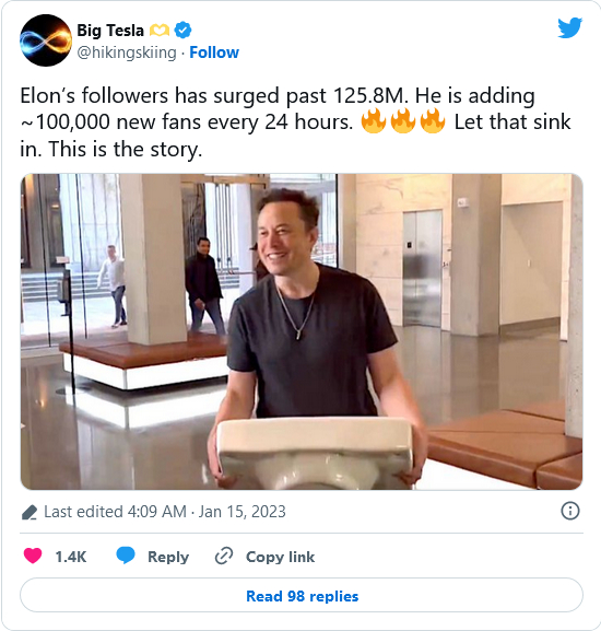 IT之家1月16日消息,推特掌舵者、首席执行官埃隆・马斯克(ElonMusk)目前的粉丝数量已经超过1.258亿。BigTesla在推文中表示:“马斯克的粉丝数量已经突破1.258亿,每24小时增加10万粉丝”。