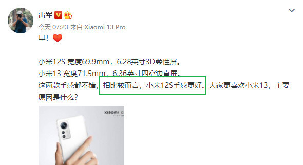 【手机中国新闻】目前,小米旗下较新的旗舰机有小米13系列和小米12S系列,其中,小米13和小米12S都主打轻薄小巧,讲究一个“好手感”。据手机中国了解,近日雷军在微博上便对比了小米13和小米12S这两款旗舰机,他表示小米12S的手感更好,结果小米13的用户和喜爱者在评论区当场就不乐意了。