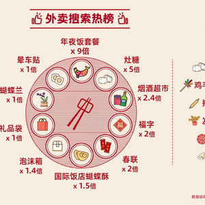 从外卖平台搜索热词榜来看,“年夜饭”依然是消费者近期最关注的年货,搜索量环比上周继续增长九倍。