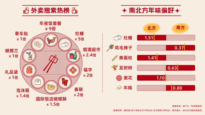 从南北年味差异来看,北方人对于灶糖、擀面杖、窗花的偏好度明显更高,这些商品的外卖订单占比显著高于整体。天津、北京和武汉近一周的灶糖外卖量位列全国前三。窗花外卖则在北京、青岛和天津销量最高。南方人的小年则从“鸡毛掸子”除尘开始,除了下单发财树,年糕也开始成为南方人未来近一个月餐桌上的主菜。
