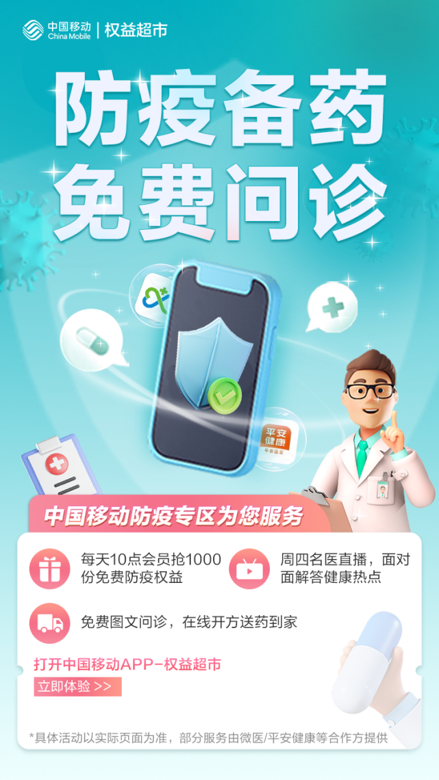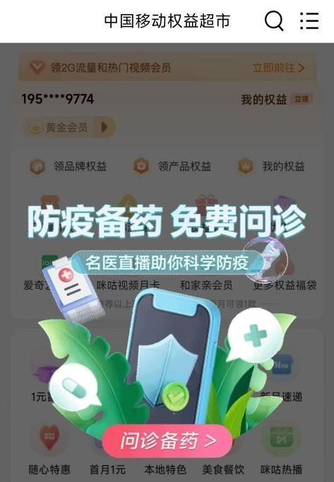 当前,每个人都成为了自己健康的第一责任人。为进一步助力科学防控,中国移动权益超市开设了健康便民服务专区,携手微医、平安好医生、好大夫在线、联仁慧康、妙健康、药联等合作伙伴,提供健康直播讲座、在线问诊购药、健康知识科普等专项服务,为需要的用户提供专业高品质的医疗健康服务。用户可通过中国移动APP-权益版块进入专区体验相关服务。